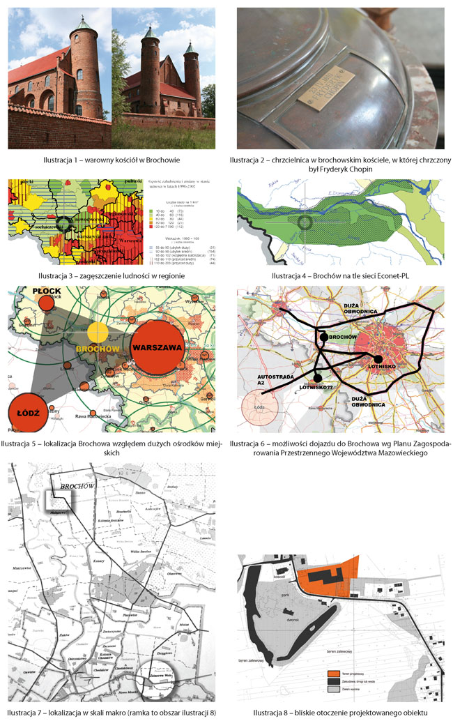 Miejscem idealnie do tego przedsięwzięcia pasującym jest Brochów nad Bzurą. Narodowy Instytut Fryderyka Chopina jako inicjator tej idei od lat stara się doprowadzić do powstania tego ośrodka. Szkoda, że poprzednie próby podjęcia tematu nie skończyły się realizacją. Kolejne lata mijają bezpowrotnie – do roku 2010 zapewne zbudowanie ośrodka nie nastąpi. W obliczu tego warto chociażby teoretycznie zmierzyć się z tym tematem, przyjmując, że NIFC (Narodowy Instytut Fryderyka Chopina) rzeczywiście rozpisał konkurs na projekt. Dzięki uprzejmości Instytutu autor mógł zapoznać się z aktualną sytuacją oraz oczekiwaniami wobec przyszłego Ośrodka. Wynikają z nich następujące parametry określające projektowany budynek, zastosowane w projekcie: